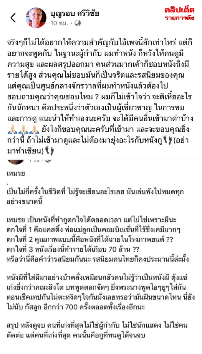 เพจดังกล่าวว่า "จริงๆก็ไม่ได้อยากให้ความสำคัญกับไอ้เพจนี้สักเท่าไหร่ แต่ก็อยากจะพูดกับ ในฐานะผู้กำกับ ผมทำหนัง ก็หวังให้คนดูมีความสุข และผลสรุปออกมา คนส่วนมากเค้าก็ชอบหนังถึงมีรายได้สูง ส่วนคุณไม่ชอบมันก็เป็นจริตและรสนิยมของคุณ