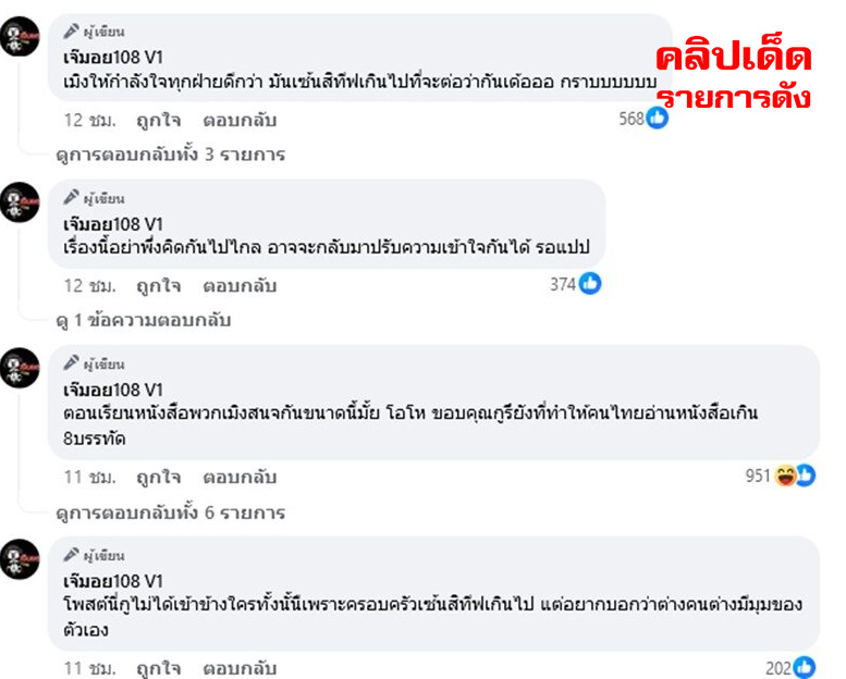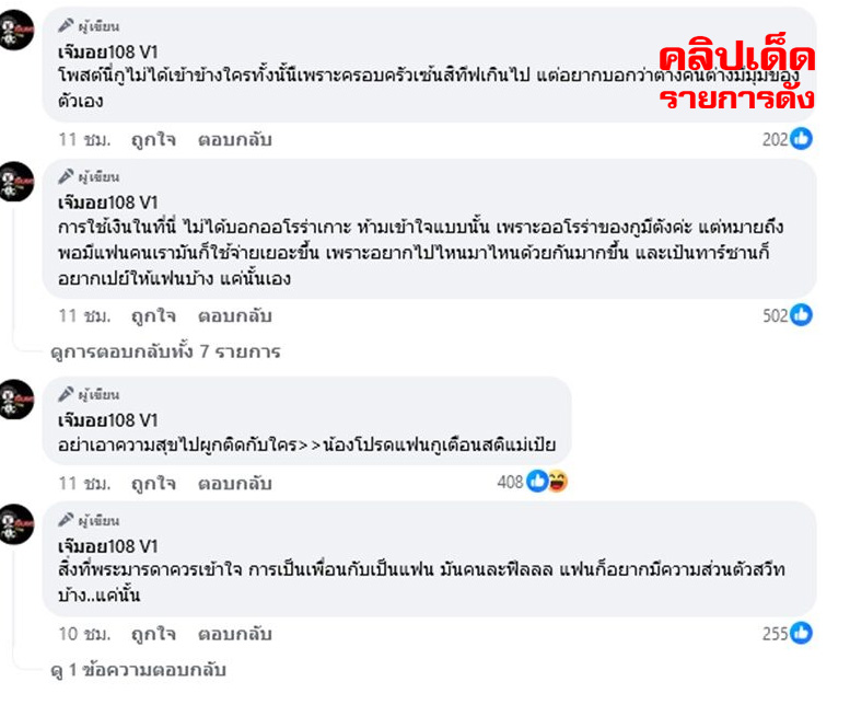 เรื่องราวนี้ทำให้แฟนๆ ในวงการบันเทิงตื่นเต้นกับเรื่องราวที่ไม่ธรรมดา โดยเฉพาะถ้าพิจารณาจากเหตุการณ์ล่าสุดที่เพจ "เจ๊มอย108 V1"