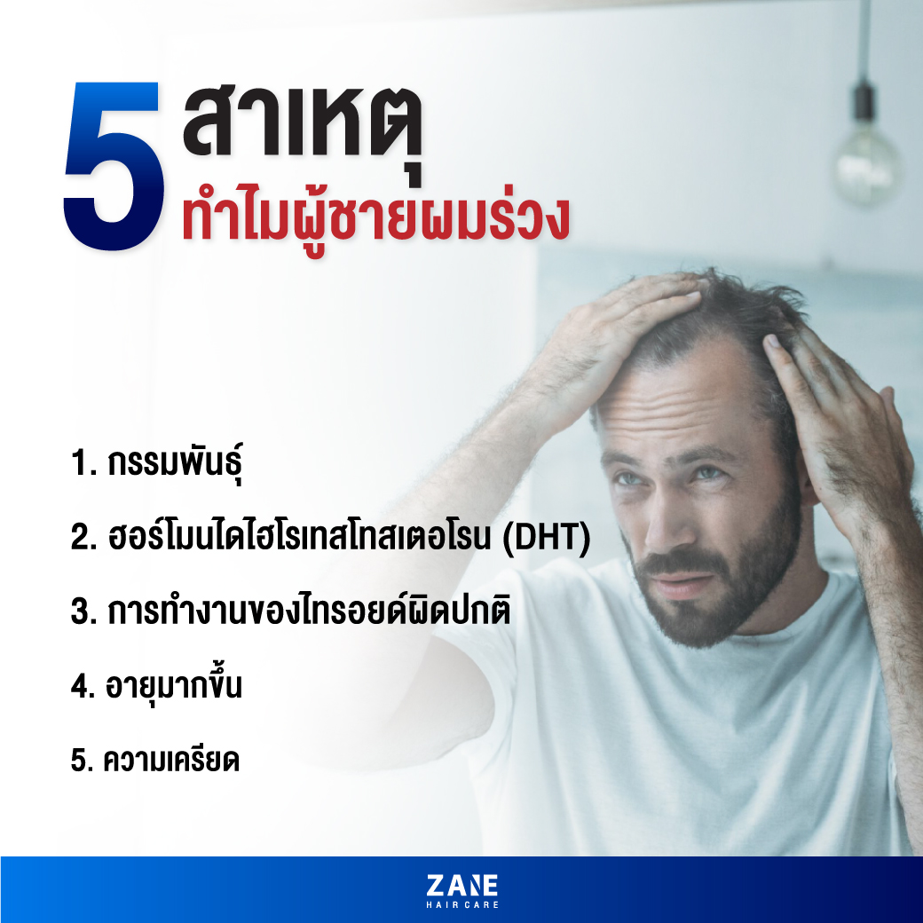 ปกติแล้วร่างกายของคนเราทั้ง ชาย และ หญิง จะมีฮอร์โมนเทสโทสเตอโรน (Testosterone) หรือ เรียกอีกอย่างว่า ฮอร์โมนเพศชายภายในร่างกายอยู่แล้ว ซึ่งแต่ละคนก็จะมีปริมาณฮอร์โมนชายในร่างกายที่แตกต่างกันออกไป แต่ในกระบวนการทำงานของร่างกายผู้ชายนั้น เทสโทสเตอโรนจะถูกสร้างขึ้นจากต่อมลูกหมาก และ อัณฑะ ผู้ชายจะมีการเปลี่ยนแปลงจาก ฮอร์โมนเทสโทสเตอโรน ไปเป็น ฮอร์โมนไดไฮโรเทสโทสเตอโรน (DHT) ซึ่งการเปลี่ยนแปลงนี้ จะมีผลต่อการเปลี่ยนแปลงของเส้นผมของผู้ชาย ทำให้เส้นผมอ่อนแอ ไม่แข็งแรง หลุดร่วงง่าย การเกิดใหม่ของเส้นผมก็จะช้าลง หรือ แม้กระทั่งเส้นผมที่เกิดขึ้นมาใหม่ก็จะเติบโตไม่เต็มที่ เส้นผมบางลงเรื่อยๆ จนกระทั่ง รากผมไม่แข็งแรงจนไม่มีเส้นผมงอกออกมาอีกเลย