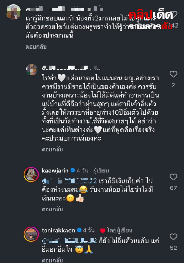 ร้อนจน "แก้ว จริญญา" เข้ามาตอบกลับด้วยตัวเองว่า "เราก็มีเงินเก็บค่า ไม่ต้องห่วงนะคะ รับงานน้อยไม่ใช่ว่าไม่มีเงินนะคะ" ขณะที่คุณสามี "โทนี่ รากแก่น" ก็เข้ามาตอบด้วยตัวเองอีกว่า "ก็ยังไม่อิ่มตัวนะคับ แต่อิ่มอกอิ่มใจ" ถือเป็นการจบดราม่านะจ๊ะทุกคน