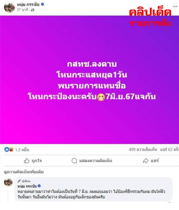 หนุ่ม กรรชัย ผู้พิธีกรรายการได้รับคำสั่งจาก กสทช. ให้ช่อง 3 ระงับการออกอากาศ 'โหนกระแส' เป็นเวลา 1 วัน