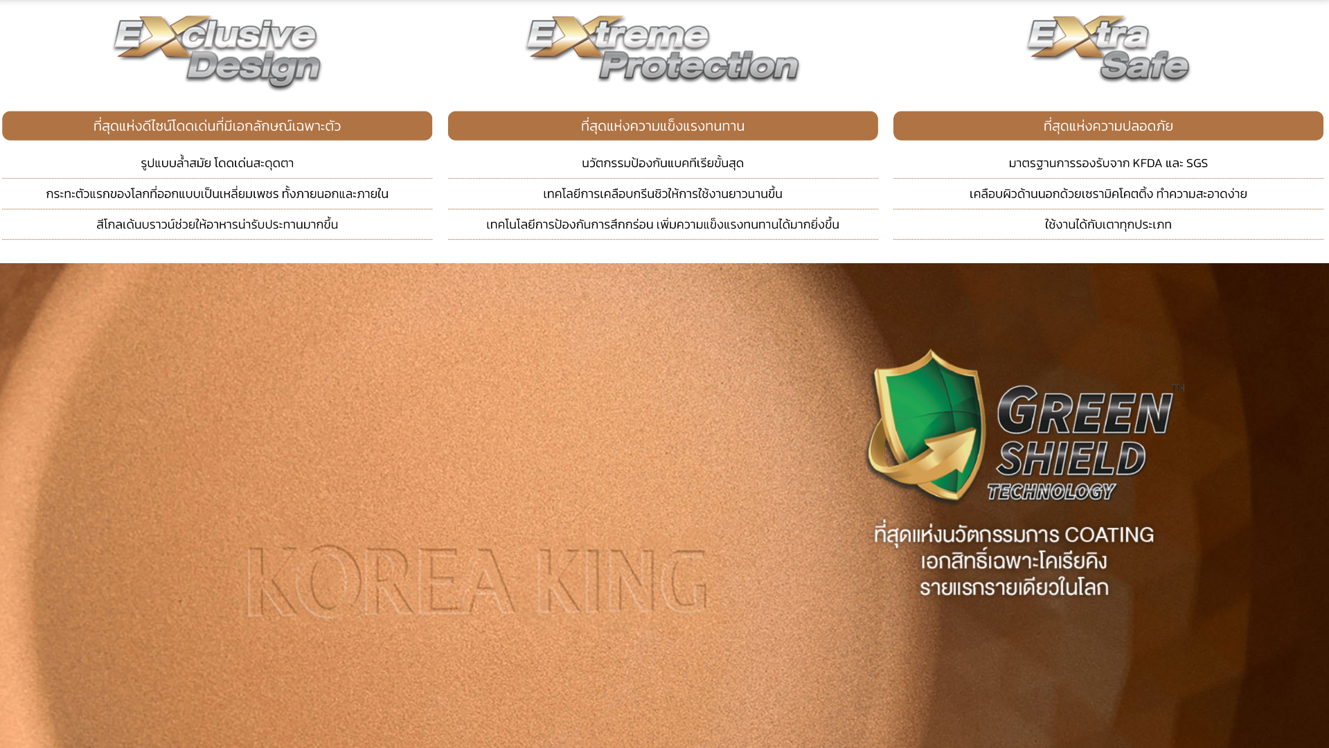 ดีไซน์และสุขภาพ: โคเรียคิงยังคงให้ความสำคัญกับ สุขภาพ ความปลอดภัย และดีไซน์ เป็นอันดับแรก การเคลือบผิวด้วยเทคโนโลยี Diamond x Ceramic ที่พัฒนาขึ้นใหม่นี้ จะช่วยให้การทำอาหารสนุกขึ้น ดีต่อสุขภาพมากขึ้น ด้วยการลดการใช้น้ำมันได้อย่างมี