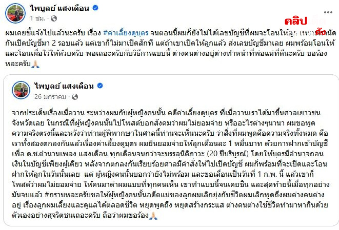 “ผมเคยชี้แจ้งไปแล้วนะครับ เรื่อง #ค่าเลี้ยงดูบุตร จนตอนนี้ผมก็ยังไม่ได้เลขบัญชีที่ผมจะโอนให้ลูก เพราะเรานัดกันเปิดบัญชีมา 2 รอบแล้ว