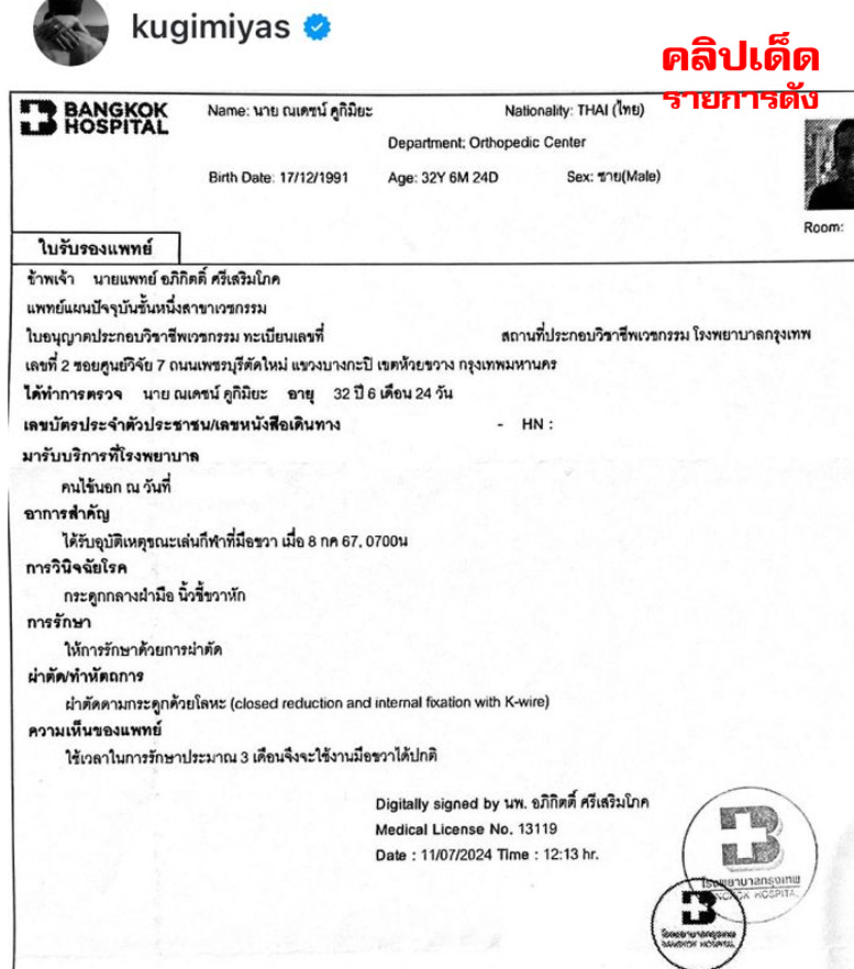 “วันนี้ผมมาโรงพยาบาลเพื่อทราบรายละเอียดการรักษาหลังผ่าตัดและใส่เฝือก เลยทราบว่าก่อนหน้านั้นผมมีความเข้าใจคลาดเคลื่อนเกี่ยวกับอาการของผม ผมขอชี้แจงใหม่อีกครั้งว่า ผลสรุปอาการจากอุบัติเหตุ โดยการยืนยันจากแพทย์คือ กระดูกกลางฝ่ามือนิ้วชี้ขวาหัก ต้องใช้เวลา 3 เดือน