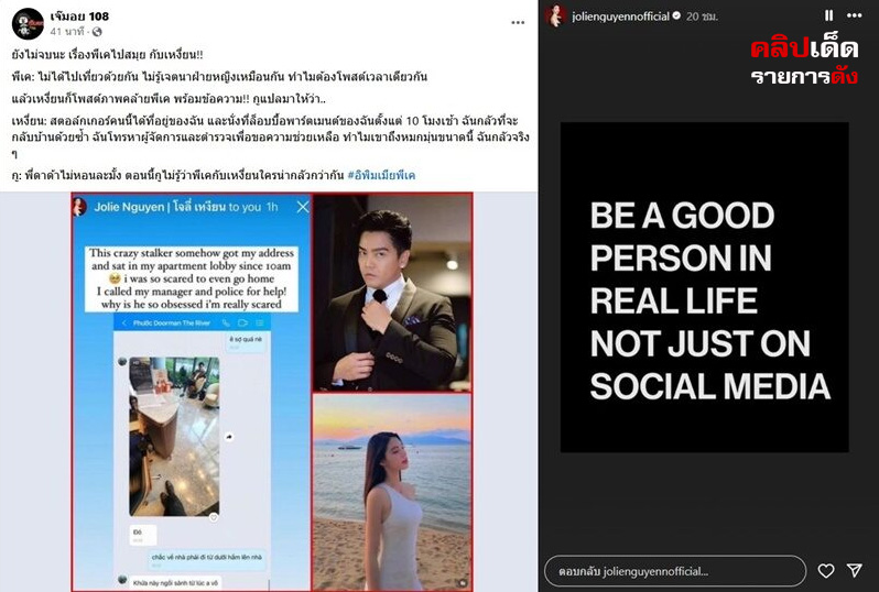โดยล่าสุด โจลี่ เหงียน ยังโพสต์ข้อความภาษาอังกฤษด้วยความหมายประมาณว่า เป็นคนดีในชีวิตจริง ไม่ใช่แค่ในโซเชียลมีเดีย