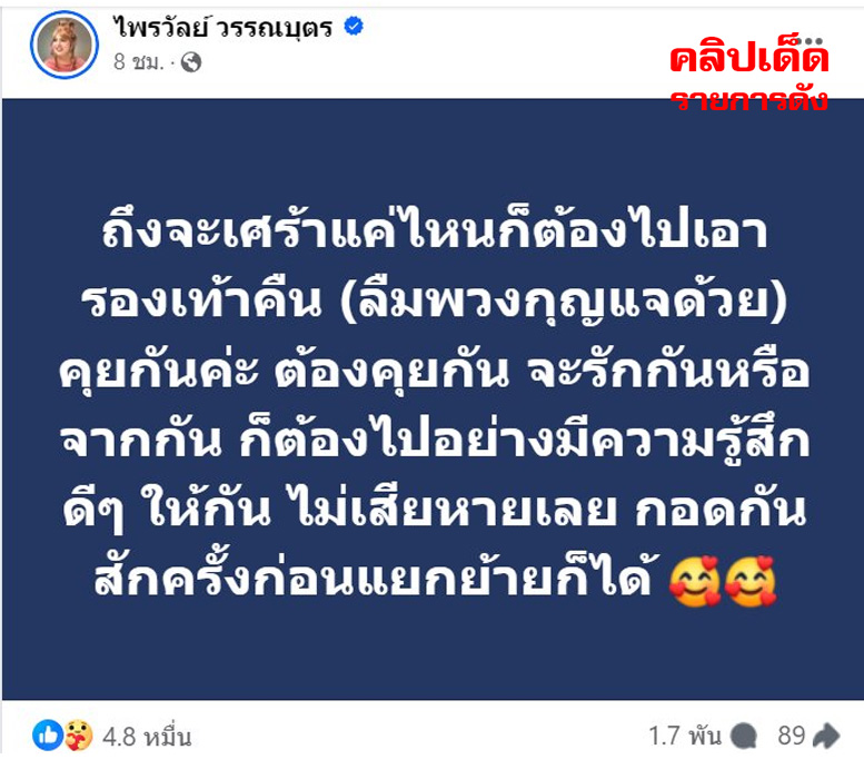 จากนั้นไม่นานก็ได้โพสต์ข้อความอีกว่า ถึงจะเศร้าที่ต้องจากกัน แต่ก็ต้องคุยกันให้จบลงด้วยดี กอดกันสักครั้งก่อนแยกย้ายไปตามเส้นทางของตัวเอง “ถึงจะเศร้าแค่ไหนก็ต้องไปเอารองเท้าคืน (ลืมพวงกุญแจด้วย) คุยกันค่ะ ต้องคุยกัน จะรักกันหรือจากกัน ก็ต้องไปอย่างมีความรู้สึกดี ๆ ให้กัน ไม่เสียหายเลย กอดกันสักครั้งก่อนแยกย้ายก็ได้”ท่ามกลางข้อความส่งกำลังใจจากผู้ติดตามทั้งหลาย ทาง ‘แพรรี่’ ก็ได้เข้ามาคอมเมนต์ไว้ในใต้โพสต์ว่า แม้จะไม่ใช่