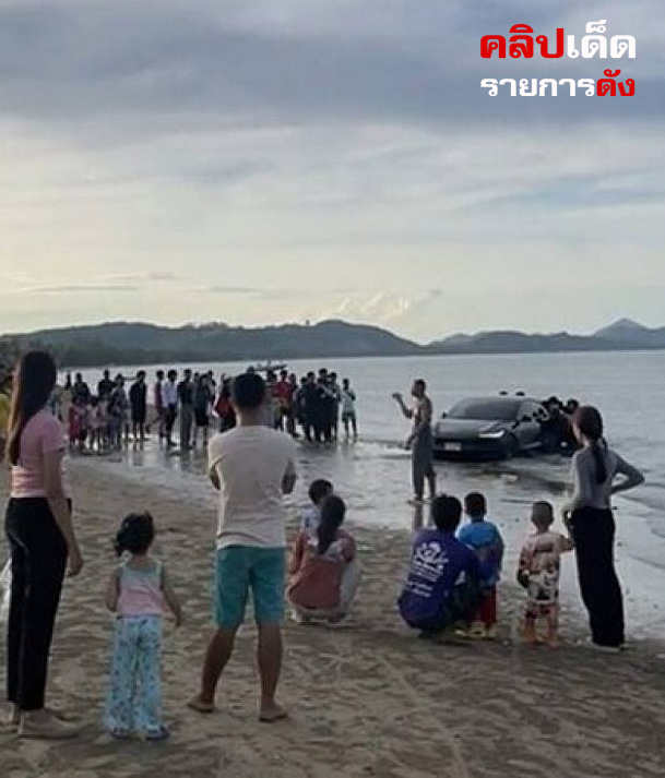 สไปรท์ SPD' ขับ Tesla สีดำลงชายหาด ล้มรถลงหลุมทราย ทีมงานประกอบด้วย 4 คนเข้าพบตำรวจ