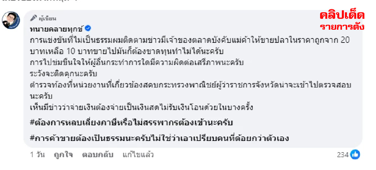 ทนายเดชา ซึ่งติดตามสถานการณ์ได้โพสต์ข้อความบนเพจ ‘ทนายคลายทุกข์’ เรียกร้องให้หน่วยงานที่เกี่ยวข้องเข้าไปตรวจสอบ โดยระบุว่าการกดราคาสินค้าและบังคับให้ขายในราคาต่ำจนขาดทุนถือเป็นการข่มขืนใจและมีความผิดตามกฎหมาย