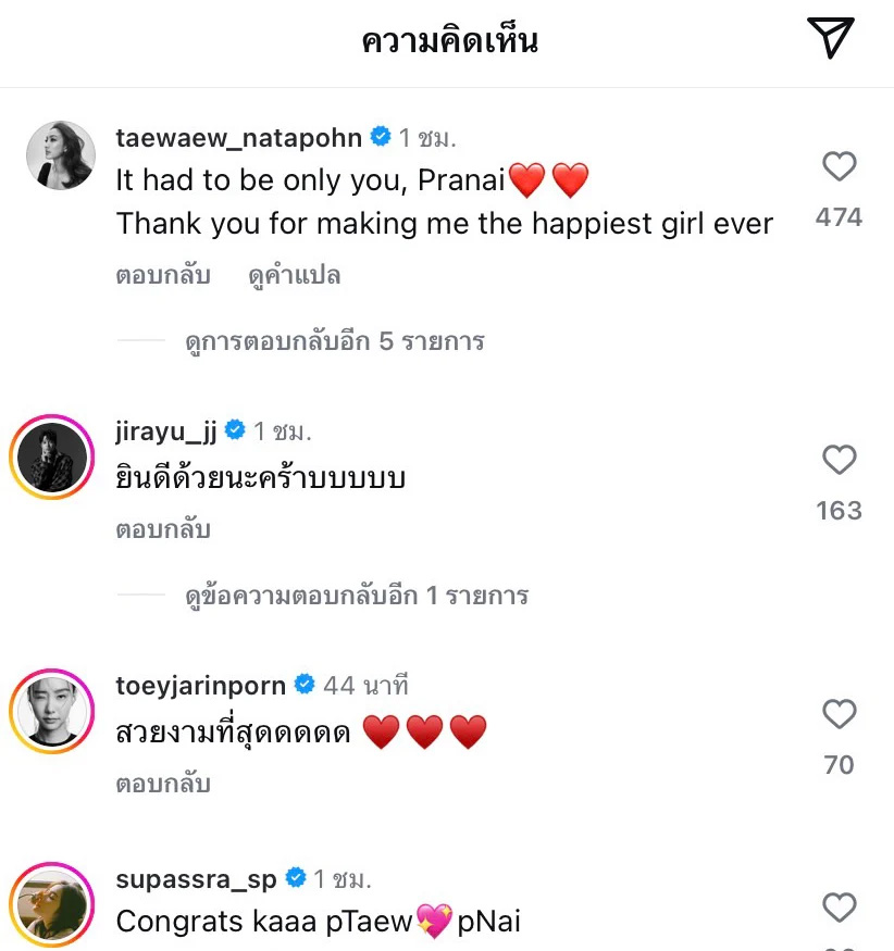 "She said YES" ร่วมกับคำตอบที่แสดงถึงความภาคภูมิใจของสาวแต้วที่ได้มาตอบคำถามนั้นว่า "It had to be only you, Pranai. Thank you for making me the happiest girl ever."