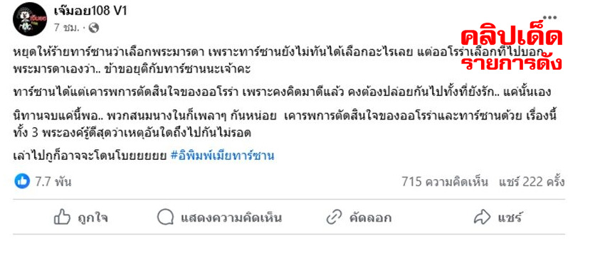 แต่ออโรร่าได้เลือกไปบอกพระมารดาเองว่า.. ข้าขอยุติกับทาร์ซานนะเจ้าคะ" เหตุการณ์นี้ทำให้ผู้ที่ติดตามหน้าเพจดังกล่าวกระตือรือร้นและทะยานไปกล่าวความเห็นอย่างเต็มที่ใต้โพสต์นี้