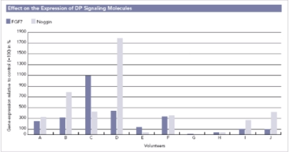 ซึ่งสิ่งเหล่านี้ได้รับการยืนยันด้วย Phototrichogram technique โดยพบว่าหลังจากใช้ผลิตภัณฑ์ Anagain เป็นเวลา 3 เดือน จะลดอาการผมร่วง เเละเพิ่มพลังชีวิตเเก่เส้นผม (increase hair vitality) โดยเห็นได้ว่าความหนาเเน่นของ anagen hair นั้นเพิ่มขึ้นในขณะที่ความหนาเเน่นของ telogen hair นั้นลดลงเป็นอย่างมาก ผลการศึกษา Anagain ผลลัพธ์การเเสดงออกทางยีนส์ จากอาสาสมัครจากอาสาสมัครอายุ 46-60 ปี ผลลัพธ์ที่ได้จาก Anagain ในด้านการเจริญเติบโตของเส้นผม ได้ถูกวิเคราะห์โดยใช้ DNA microarray technique ซึ่งการทดสอบนี้ได้ทำกับส่วนของ hair bulb ซึ่งถอนจากบริเวณท้ายทอย ของอาสาสมัครจำนวน 10 ท่าน (หญิง4ชาย6คน) เปรียบเทียบโดยเอาเส้นผมที่ถูกถอนออกมาก่อนเเละหลังใช้ผลิตภัณฑ์แบบเจลที่มี Anagain 2% เป็นระยะเวลา 14 วัน ซึ่งการเเสดงออกของยีนส์ที่สำคัญที่พบในเส้นผมได้ถูกวิเคราะห์โดยเทคนิค PCR เเสดงให้เห็นว่ามีการเพิ่มขึ้น (up-regulation) ของ DP signaling molecules 2 ชนิด ซึ่งมีผลต่อการริเริ่มวงจรชีวิตของเส้นผมใหม่โดย การเเสดงออกของ Noggin(ซึ่งเป็นโปรตีนทำให้ช่วง Telogen phase สั้นลง) โดยพบว่า Noggin เพิ่มขึ้นถึง 56% โดยเฉลี่ย การเเสดงออกของ FGF-7 (fibroblast growth factor-7) ซึ่งช่วยการเพิ่มจำนวนเซลล์ของ mstrix keratinocytes ในช่วงเริ่มต้นของ anagen phase ครั้งใหม่โดยเพิ่มขึ้นถึง 85% โดยเฉลี่ย ซึ่งผลเหล่านี้เเสดงให้เห็นว่า Anagain สามารถกระตุ้น DP ในการนำไปสู่การเจริญเติบโตของเส้นผมใหม่ได้ ดังรูปด้านล่าง