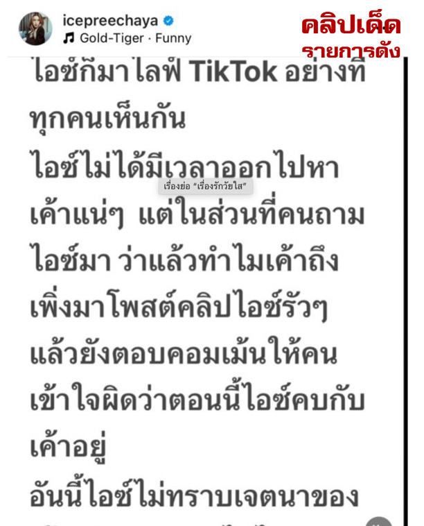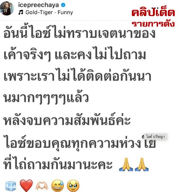คลิปจูบระหว่าง "ไอซ์ ปรีชญา" และหนุ่มลูกครึ่งไทย-อิตาเลียนที่หลุด ประกาศยุติความสัมพันธ์และกลับมาโฟกัสกับงานพร้อมเรียกร้องเรื่องของกฎหมาย