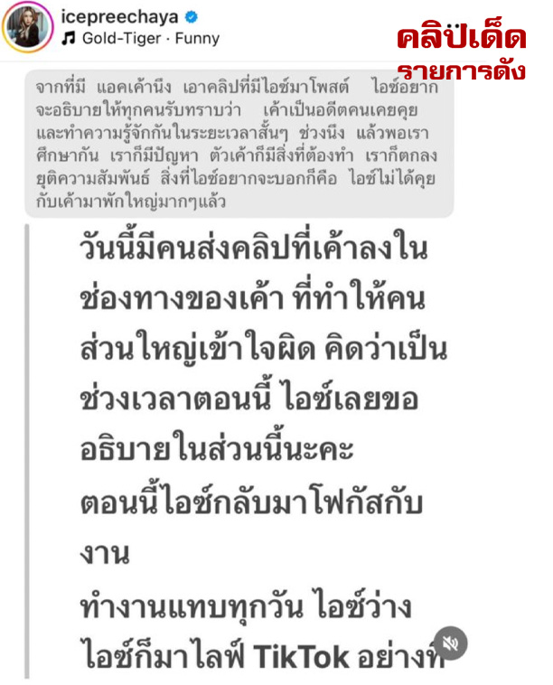 ไอซ์ ปรีชญา: สวัสดีค่ะ ขอบคุณที่ให้โอกาสพูดคุยค่ะ เรื่องที่เกิดขึ้นกับคลิปโพสต์นั้นเป็นเรื่องที่ไม่คาดคิด เราเคยมีความสัมพันธ์ในอดีตกับบุคคลที่โพสต์คลิปนั้น และหลังจากที่เราศึกษากันมา เราพบว่ามีปัญหาบางอย่างเกิดขึ้น เราจึงตกลงยุติความสัมพันธ์นั้น เป็นเรื่องธรรมดาที่เกิดขึ้นในชีวิตประจำวันของเราค่ะ ที่เราต้องเผชิญหน้ากับปัญหาและต้องมีความเป็นธรรมกับตัวเราเองและกับผู้อื่น