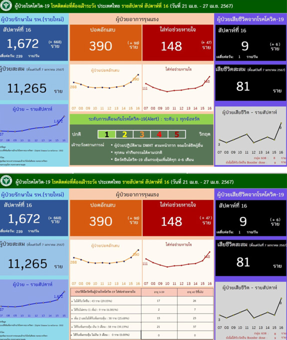 มอบหมายกรมควบคุมโรคติดตามและวิเคราะห์สถานการณ์ต่อเนื่อง พร้อมกำชับทุกหน่วยงานดำเนินการตามมาตรการอย่างเคร่งครัด โดยในช่วงสัปดาห์ที่ผ่านมา ระหว่างวันที่ 21 - 27 เมษายน 2567พบผู้ป่วยโรคโควิด 19 ที่ต้องรักษาตัวในโรงพยาบาลจำนวน 1,672 ราย เฉลี่ย 239 รายต่อวัน ผู้ป่วยปอดอักเสบ 390 ราย ใส่ท่อช่วยหายใจ 148 ราย และมีผู้เสียชีวิต 9 ราย