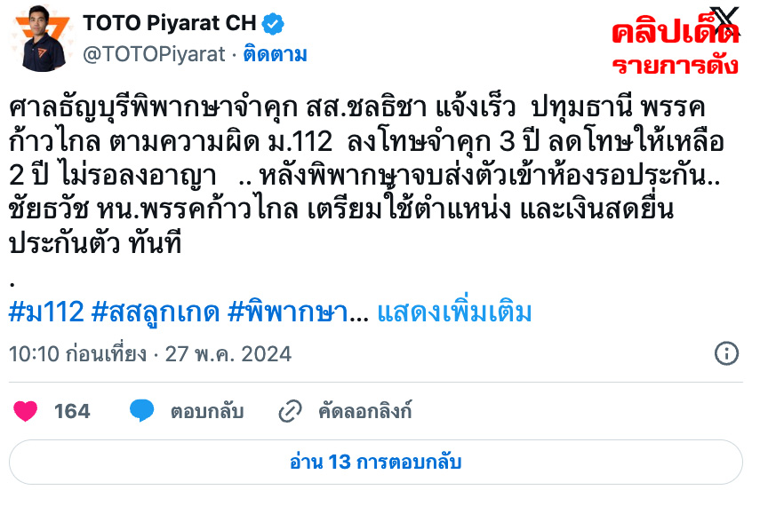 ในวันที่ 27 พฤษภาคม ปี 2567 นายชัยธวัช ตุลาธน หัวหน้าพรรคก้าวไกลพร้อมกับ นายชลธิชา แจ้งเร็ว หรือ ลูกเกด