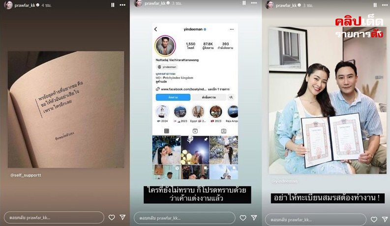 จากนั้นก็ยังได้แคปภาพหน้าอินสตาแกรมของสามีมาโพสต์ลงไอจีสตอรี่พร้อมกับเขียนแคปชั่นสถานะของเสี่ยโบ๊ท ยิ่งทำให้สงสัยเกิดอะไรขึ้นด้วยว่า “ใครที่ยังไม่ทราบ ก็โปรดทราบด้วย ว่าเค้าแต่งงานแล้ว”