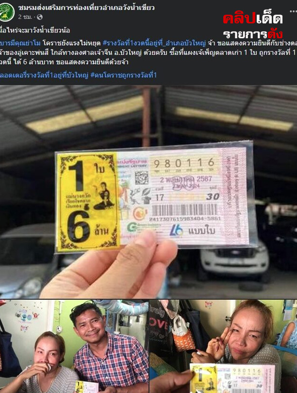 รางวัลที่ 1 อยู่โคราช ภรรยาช่างดล อู่เคาะพ่นสี มือดีหยิบโชคกลับบ้าน ถูกหวย 6 ล้าน
