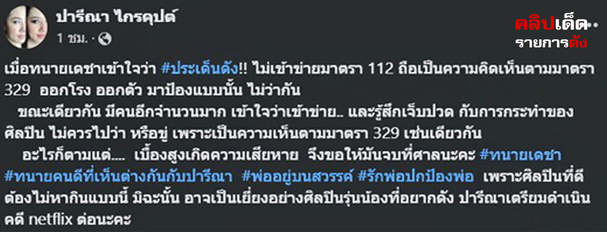 จากนั้นผู้สื่อข่าวสอบถามถึงประเด็นที่กระแสคอมเมนต์มีการพูดถึงเรื่องการฟ้องกลับ น.ส.ปารีณา กล่าวว่า 100% ไม่กลัวว่าจะโดนฟ้องกลับ เพราะถือเป็นความคิดเห็นตามมาตรา 329ต่อมา น.ส.ปารีณา เคลื่อนไหวผ่านเฟซบุ๊กอีกครั้ง โดยโพสต์ข้อความว่า “เมื่อทนายเดชาเข้าใจว่า #ประเด็นดัง!! ไม่เข้าข่ายมาตรา 112 ถือเป็นความคิดเห็นตามมาตรา 329 ออกโรง ออกตัว มาป้องแบบนั้น ไม่ว่ากันขณะเดียวกัน มีคนอีกจำนวนมาก เข้าใจว่าเข้าข่าย.. และรู้สึกเจ็บปวด กับการกระทำของศิลปิน ไม่ควรไปว่า หรือขู่ เพราะเป็นความเห็นตามมาตรา 329 เช่นเดียวกัน อะไรก็ตามแต่…. เบื้องสูงเกิดความเสียหาย จึงขอให้มันจบที่ศาลนะคะ #ทนายเดชา #ทนายคนดีที่เห็นต่างกันกับปารีณา #พ่ออยู่บนสวรรค์ #รักพ่อปกป้องพ่อ เพราะศิลปินที่ดี ต้องไม่หากินแบบนี้ มิฉะนั้น อาจเป็นเยี่ยงอย่างศิลปินรุ่นน้องที่อยากดัง ปารีณาเตรียมดำเนินคดี netflix ต่อนะคะ”