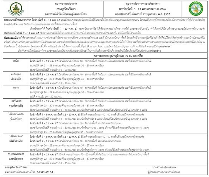 หรับชาวเรือบริเวณอ่าวไทย และทะเลอันดามัน ควรเพิ่มความระมัดระวังในการเดินเรือ และหลีกเลี่ยงการเดินเรือในบริเวณที่มีฝนฟ้าคะนองตลอดช่วง คาดหมายอากาศรายภาค ระหว่างวันที่ 7-13 พฤษภาคม พ.ศ. 2567 ภาคเหนือ ในช่วงวันที่ 8-13 พ.ค. 67 มีฝนฟ้าคะนองร้อยละ 40-60 ของพื้นที่ กับมีลมกระโชกแรงบางแห่ง รวมทั้งมีฝนตกหนักบางพื้นที่ อุณหภูมิต่ำสุด 21-28 องศาเซลเซียส อุณหภูมิสูงสุด 36-39 องศาเซลเซียส ลมตะวันออกเฉียงใต้ ความเร็ว 10-20 กม./ชม
