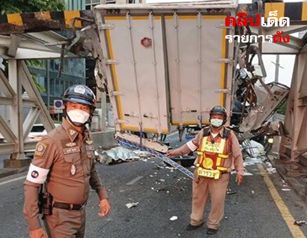 สนั่นแยกพญาไท รถบรรทุกพุ่งชน คานกั้นความสูง ทำรถติดยาวเหยียด ชนคานกั้นลอยข้ามแยกพญาไท ลังสินค้าตกเกลื่อน