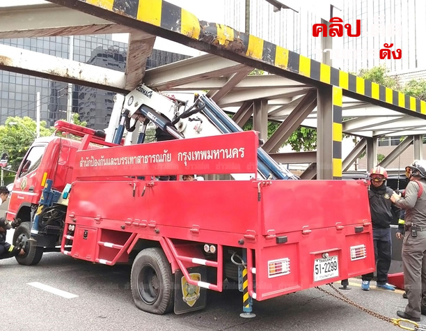 รถบรรทุกหกล้อ ปภ.ไม่ชินเส้นทาง ขับไปชนคานเหล็กจำกัดความสูง บริเวณก่อนขึ้นสะพานข้ามแยกพญาไท ทำหัวเครนเครื่องปั่นไฟท้ายรถติดแหง็ก รถจอดขวางถนน แถมกระจกด้านหน้าแตกทั้งบาน มีคนเจ็บ 1 ราย ล่าสุดย้ายออกมาเปิดให้รถวิ่งได้แล้ว... เมื่อเวลา 11.10 น. วันที่ 9 มิ.ย.60 ขณะที่ พ.ต.ท.สรรัชฎก์ ศรีปุณยาภิคุปต์ สว.จร.สน.พญาไท กำลังปฏิบัติหน้าที่ได้รับแจ้งเหตุว่ามีรถ 6 ล้อของสำนักป้องกันและบรรเทาสาธารณภัยชนคานเหล็กป้ายห้ามขึ้นสะพานติดค้างอยู่ ทำให้กีดขวางการจราจรและมีผู้ได้รับบาดเจ็บ บริเวณถนนศรีอยุธยา ฝั่งด้านขาเข้า ก่อนขึ้นสะพานข้ามแยกพญาไท แขวงทุ่งพญาไท เขตราชเทวี กทม. จึงรุดไปตรวจสอบพร้อมกับเจ้าหน้าที่สำนักป้องกันและบรรเทาสาธารณภัยกรุงเทพ (ดับเพลิงพญาไท) และมูลนิธิป่อเต็กตึ๊ง ที่เกิดเหตุ พบรถบรรทุกเครนมีเครื่องปั่นไฟด้านหลังขนาด 6 ล้อ สีแดง ยี่ห้อมิตซูบิชิ หมายเลขทะเบียน 51-2299 กรุงเทพ จอดหยุดนิ่งอยู่ และกระจกด้านหน้าแตกทั้งบาน โดยส่วนหัวเครนยกของที่อยู่ท้ายรถติดคากับคานเหล็กป้ายห้ามรถบรรทุกตั้งแต่ 6 ล้อขึ้นไปหรือรถสูงเกิน 3.10 ม.ขึ้นสะพาน ขณะเดียวกันพบผู้ได้รับบาดเจ็บ 1 ราย ทราบชื่อต่อมา นายสาธิต บัวลอย พนักงานป้องกันและบรรเทาสาธารณภัยชำนาญการ สถานีบางชัน ได้รับบาดเจ็บบริเวณศีรษะ เนื่องจากกระแทกกับกระจกหน้ารถ เจ้าหน้าที่นำตัวส่ง รพ.รามาฯ อาการปลอดภัยแล้ว