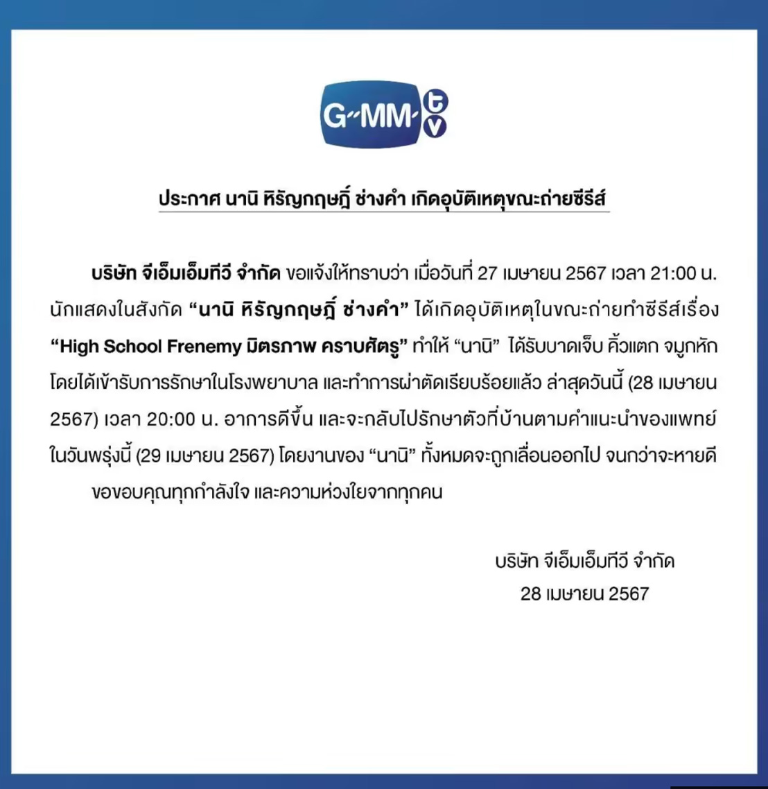 ทำเอาแฟนคลับตกอกตกใจกันเป็นแถว เมื่อทาง GMMTV ต้นสังกัดแจ้งว่านักแสดงหนุ่ม “นานิ – หิรัญกฤษฎิ์ ช่างคำ” ประสบอุบัติเหตุระหว่างการถ่ายทำซีรีส์เรื่อง “High School Frenemy มิตรภาพ คราบศัตรู” ทำให้คิ้วแตก จมูกหัก ต้องเข้ารับการผ่าตัดและเลื่อนงานทั้งหมดออกไปจนกว่าจะหายดี งานนี้แฟน ๆ หลายคนต่างส่งกำลังใจคอมเมนต์อยากให้หนุ่มนานิหายป่วยไว ๆ โดยทางต้นสังกัดออกแถลงการณ์ระบุว่า “บริษัท จีเอ็มเอ็มทีวี จำกัด ขอแจ้งให้ทราบว่า เมื่อวันที่ 27 เมษายน 2567 เวลา 21:00 น. นักแสดงในสังกัด “นานิ หิรัญกฤษฎิ์ ช่างคำ” ได้เกิดอุบัติเหตุในขณะถ่ายทำซีรีสเรื่อง “High School Frenemy มิตรภาพ คราบศัตรู” ทำให้ “นานิ” ได้รับบาดเจ็บ คิ้วแตก จมูกหัก โดยได้เข้ารับการรักษาในโรงพยาบาล และทำการผ่าตัดเรียบร้อยแล้ว ล่าสุดวันนี้ (28 เมษายน 2567) เวลา 20:00 น. อาการดีขึ้น และจะกลับไปรักษาตัวที่บ้านตามคำแนะนำของแพทย์ในวันพรุ่งนี้ (29 เมษายน 2567 โดยงานของ “นานิ” ทั้งหมดจะถูกเลื่อนออกไป จนกว่าจะหายดี ขอขอบคุณทุกกำลังใจ และความห่วงใยจากทุกคน”
