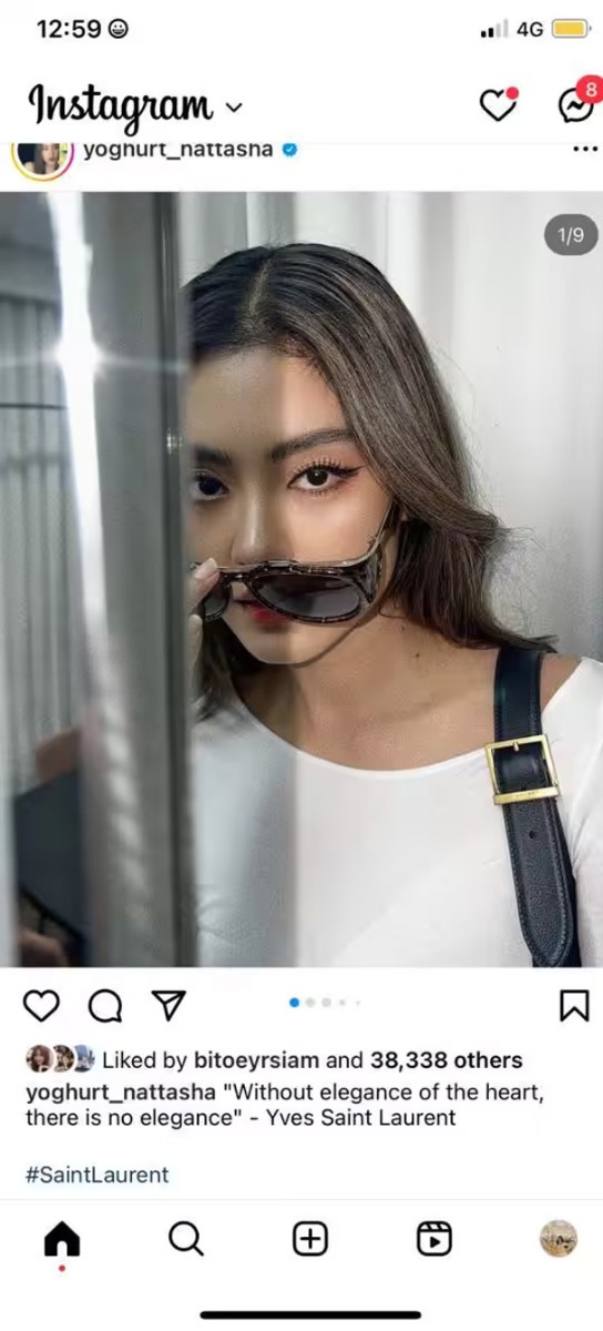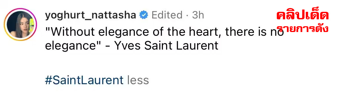 โดยล่าสุด โยเกิร์ต ณัฐฐชาช์ ได้โพสต์ภาพพร้อมพร้อมคำคมของ Yves Saint Laurentผู้ก่อตั้งแบรนด์ Saint Laurent ว่า "Without elegance of the heart, there is no elegance" ที่แปลว่า "หากปราศจากความสง่างามของหัวใจ ก็ไม่มีความสง่างาม"