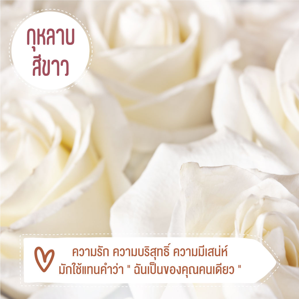 ดอกกุหลาบสีขาว หมายถึง ความรัก ความบริสุทธิ์ ความมีเสน่ห์ มักใช้แทนคำว่า "ฉันเป็นของคุณคนเดียว"