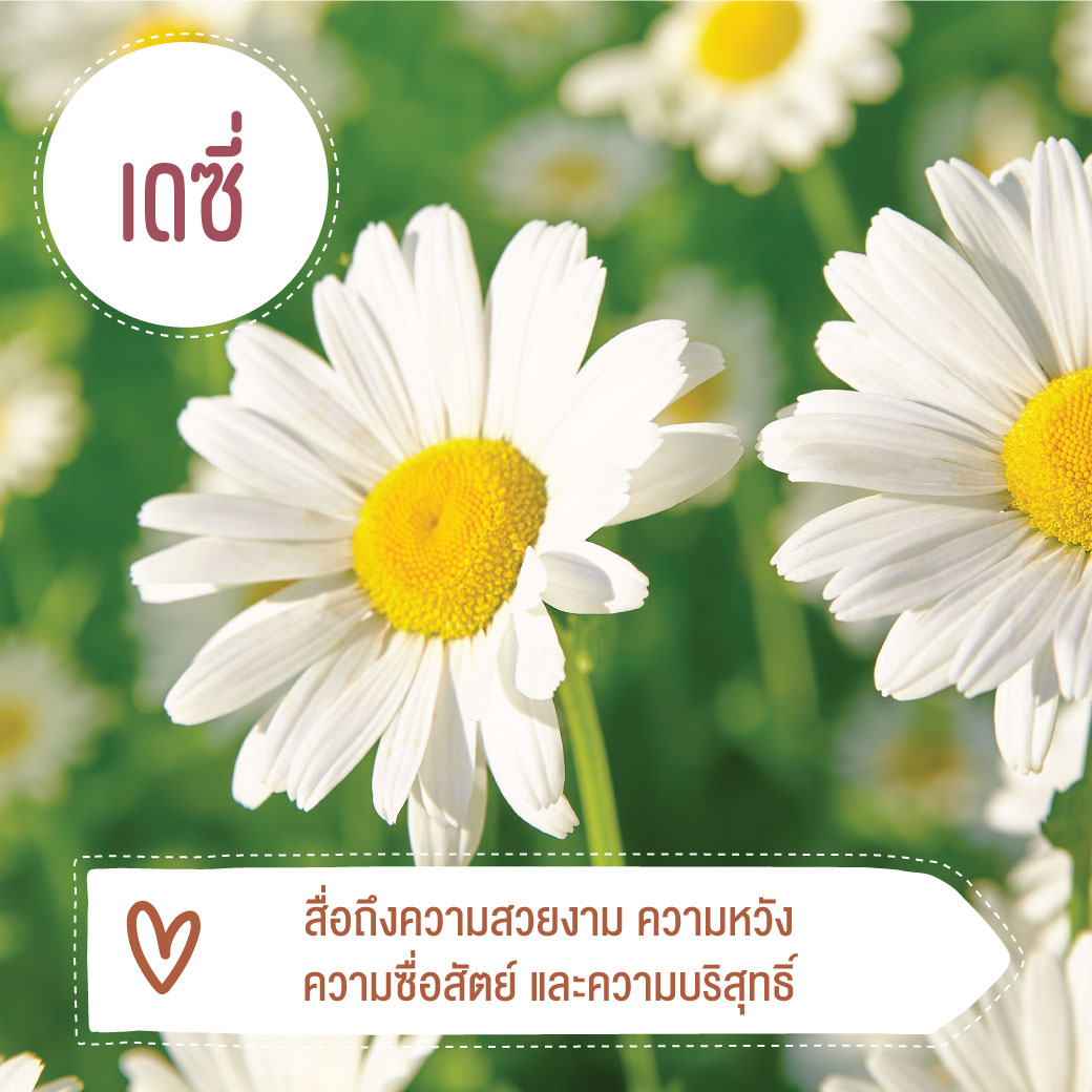 ดอกเดซี่ หมายถึง ดอกไม้สุดคลาสสิกที่สื่อถึงความสวยงาม ความหวัง ความซื่อสัตย์ และความบริสุทธิ์ จึงเหมาะจะมอบให้กับคนรักที่กำลังต้องการกำลังใจ นอกจากนี้ยังเป็นดอกไม้ประจำวันครบรอบแต่งงาน 5 ปีอีกด้วย