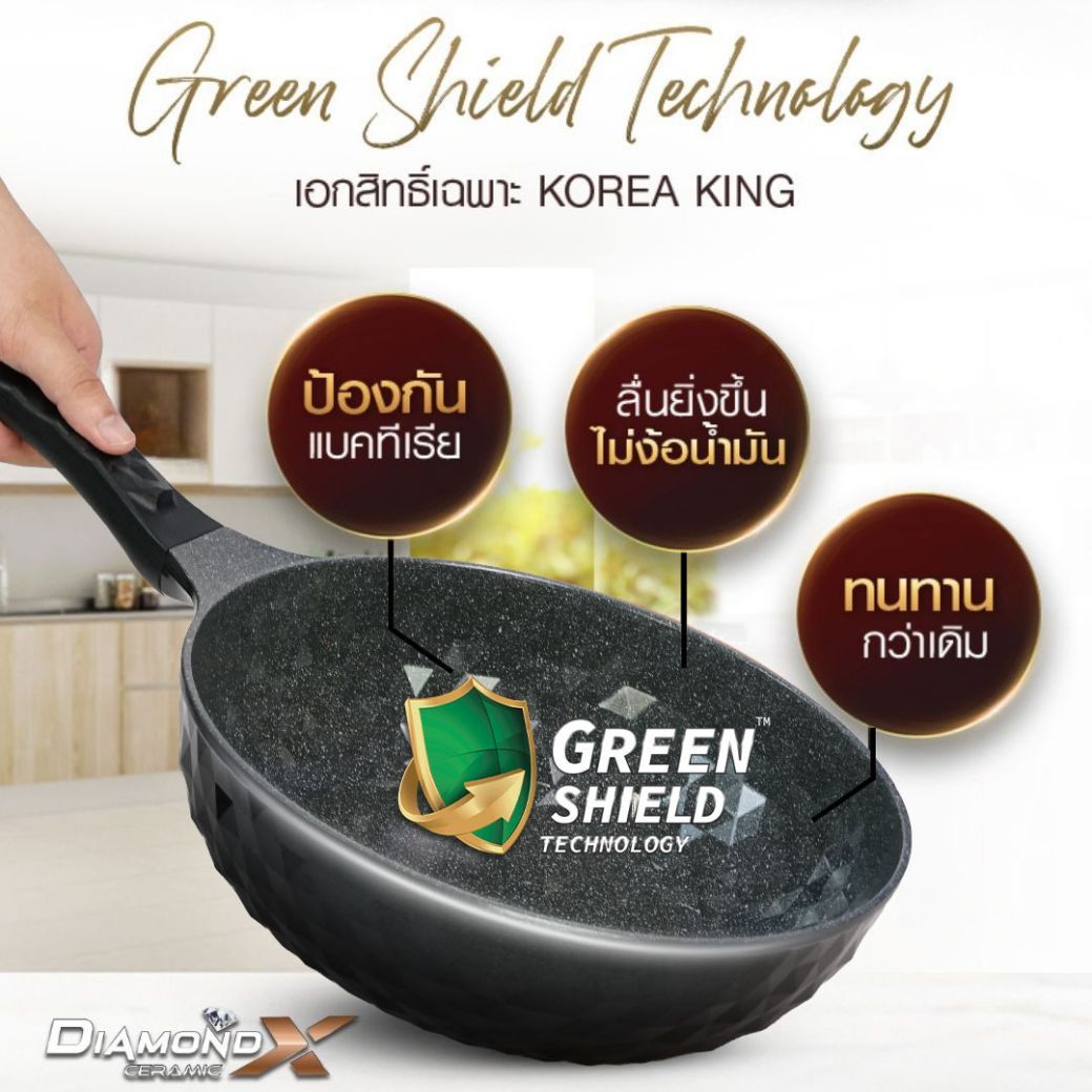 สัมผัสความล้ำหน้าของการทำอาหารด้วย Korea King Diamond X Ceramic กระทะที่ผสมผสานนวัตกรรมเอกสิทธิ์เฉพาะเข้ากับดีไซน์ที่หรูหราเหนือใคร ด้วยรูปลักษณ์ที่พัฒนาต่อยอดจากรุ่น Diamond Series ที่เป็นกระทะที่ดีที่สุดของเรา มาพร้อมการเคลือบผิวใหม่ล่าสุด Green Shield Technology ที่จดสิทธิบัตรโดย Korea King เป็นรายแรกและรายเดียวในโลก มั่นใจได้ถึงคุณภาพและความปลอดภัยสูงสุด